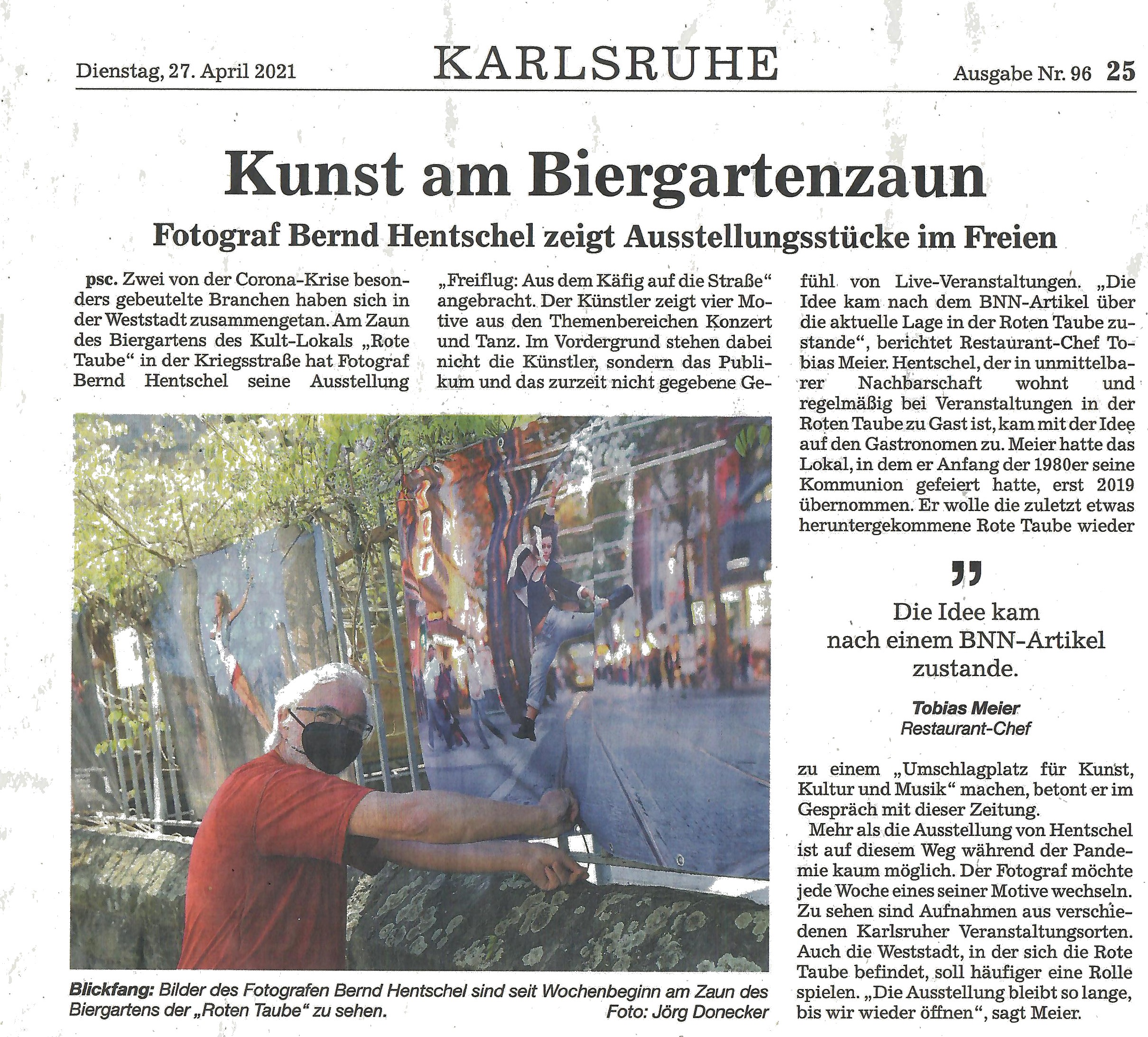 Seit dem 26. April 2021 werden am Zaun der Rote Taube, einer Kunst-, Kultur- und Musikkneipe in Karlsruhe, fortlaufend Fotografien von mir gezeigt. Der Zaun ist dabei kein Provisorium, sondern bewusst gewählter Ausstellungsort. Die Arbeiten sind unmittelbar im Alltag sichtbar – ohne Eintritt, ohne Öffnungszeiten und ohne die implizite Erwartungshaltung klassischer Kunsträume.